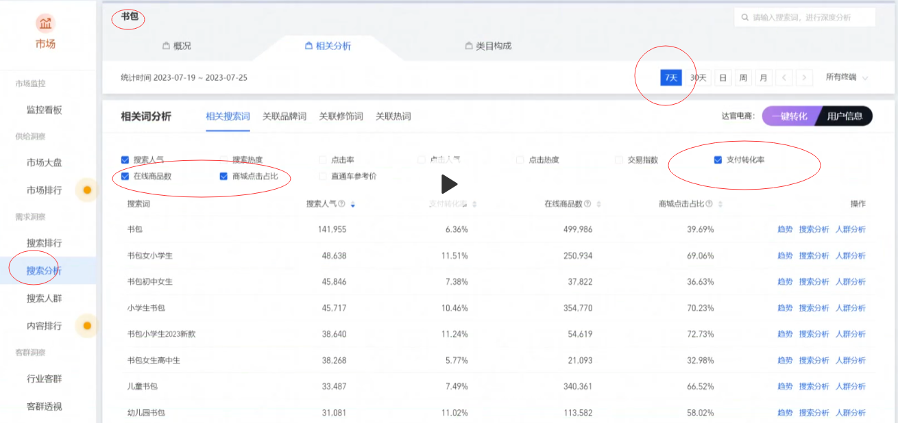 选好赛道就要开始考虑用什么款来匹配。在选款过程中,可以通过热搜词、蓝海词、高意向词和小红书反向选款等方法,找到有潜力的产品。在选款时,应注意细节,如对手销量高时要做差异化,选择新品和能打得过的对手。