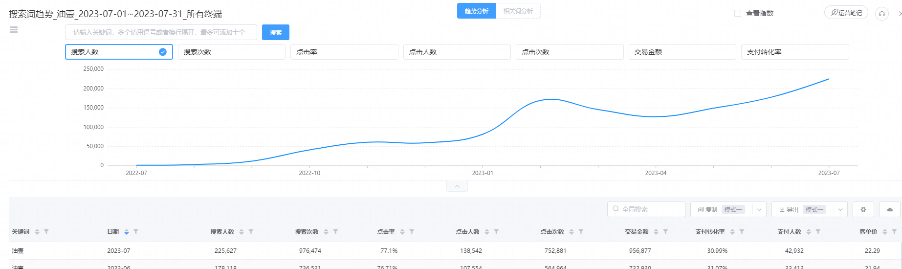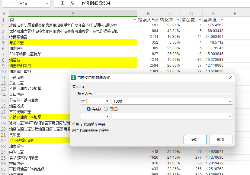 我想了一下,这里应该要选择搜索人气高的,量小也没意义吧,就按1000为基准,少于1000的就不去看了