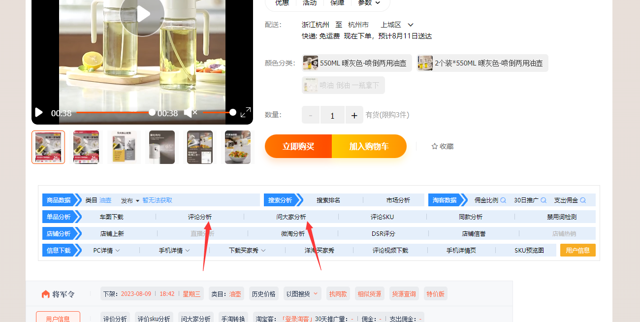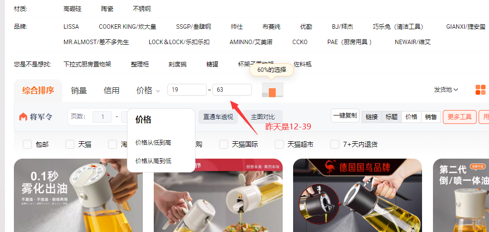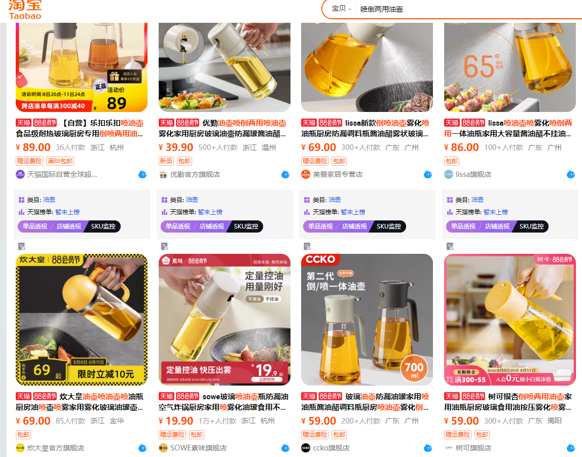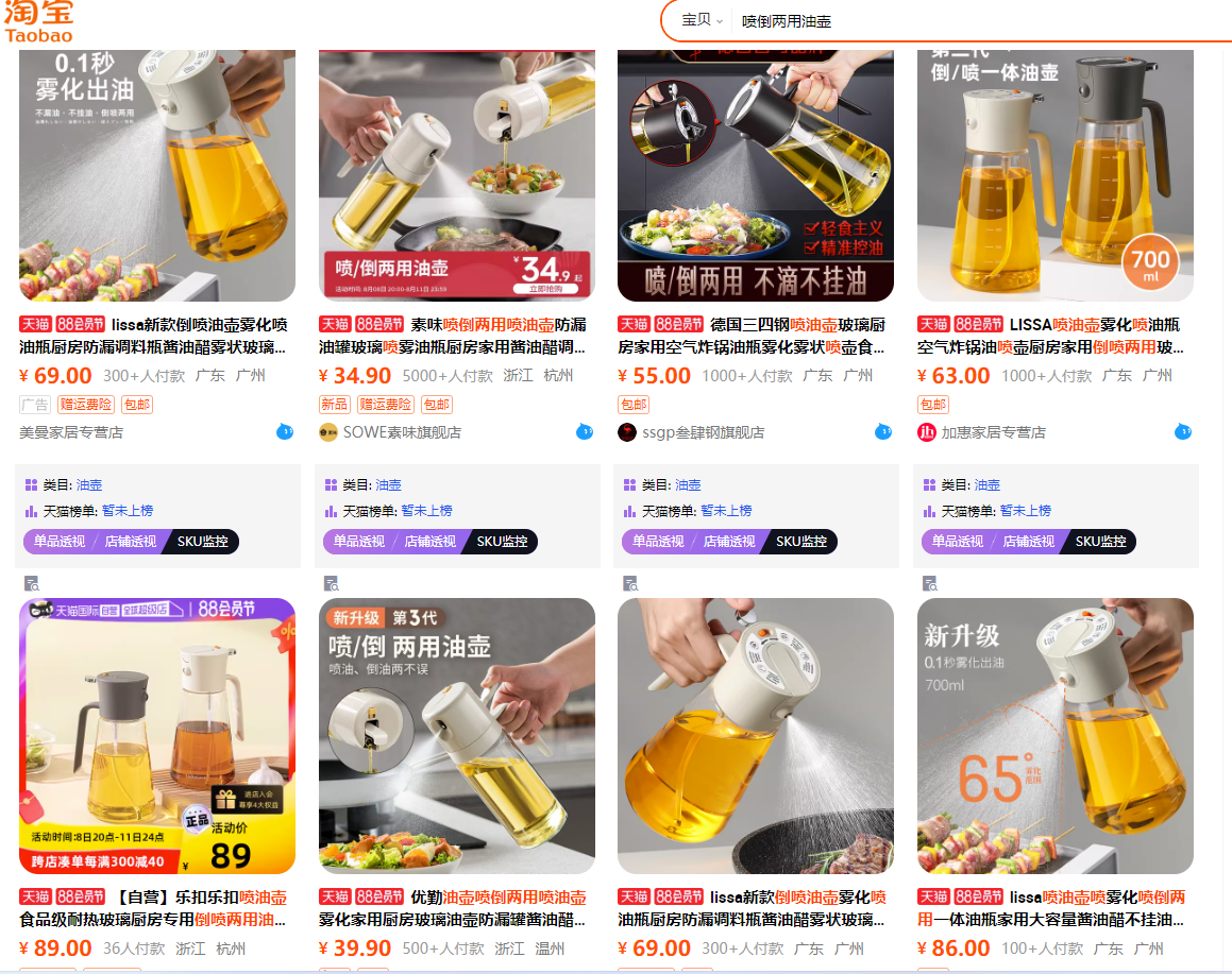 目前找到了一款成本15元左右的喷倒两用油壶,所以售价期望是30以上的,销量高的找10个商品。