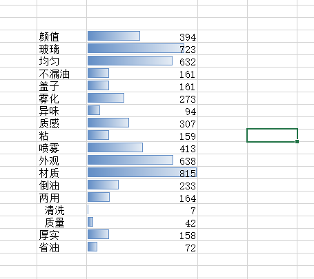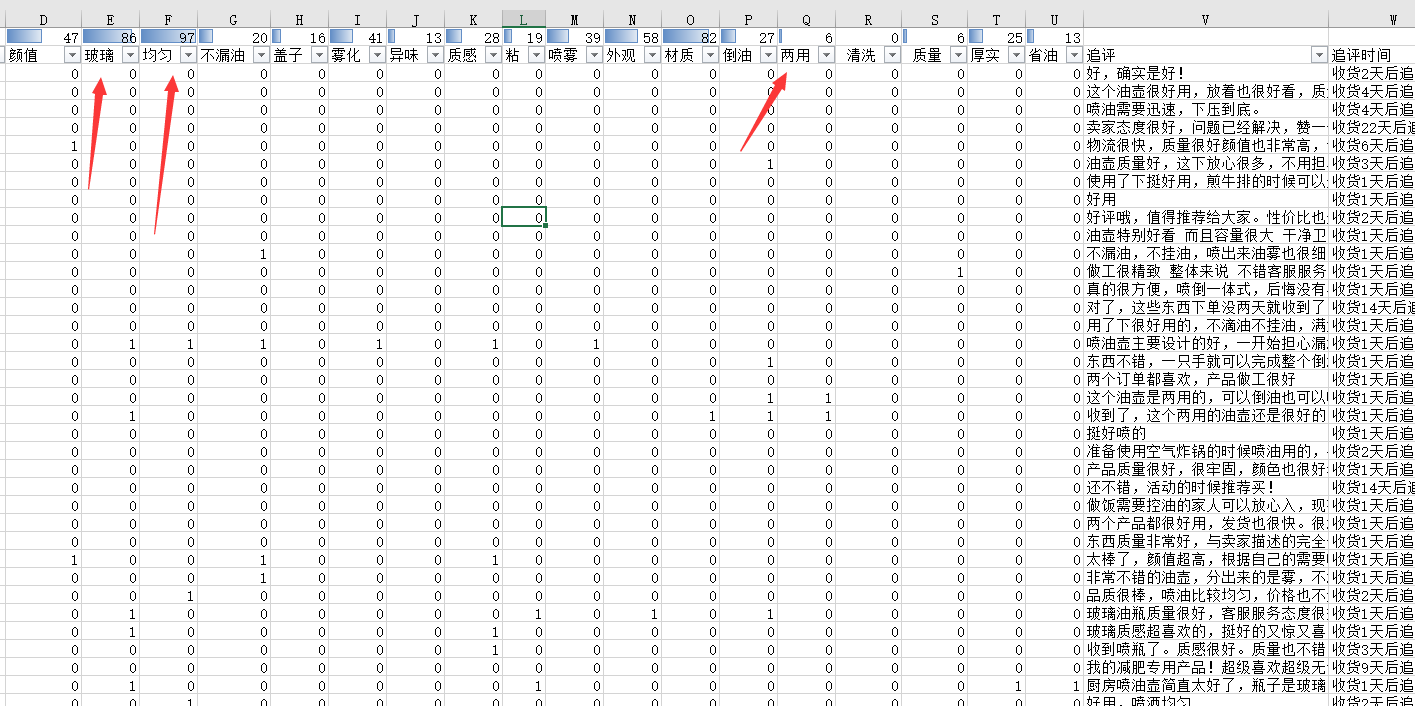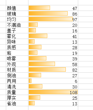 从这里可以得出来的结论是, 顾客比较在意的是玻璃材质,均匀是指喷油很均匀, 两用反而说得少,外观和喷雾