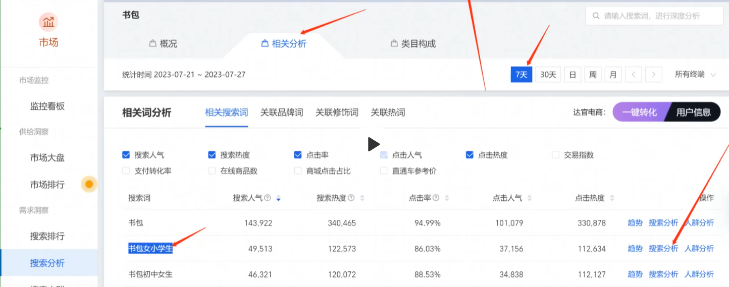 - 如果词不够,可以去大类目找词,找搜索分析里面的相关搜索词
