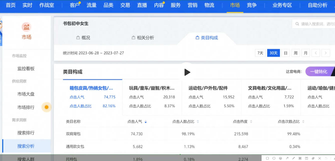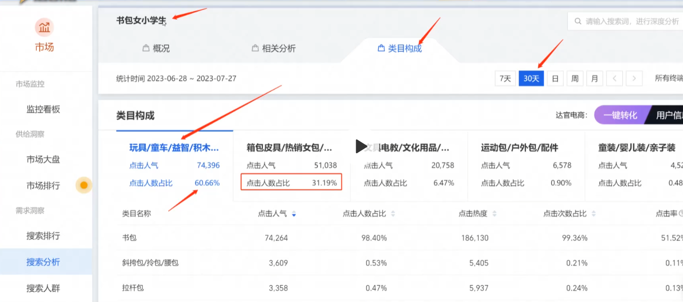 - 如果不确定类目是什么,可以在搜索分析里面看类目构成,找适合自己的最优类目,一般多少是清楚的
